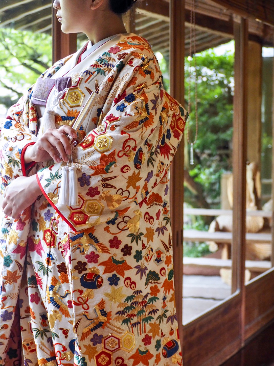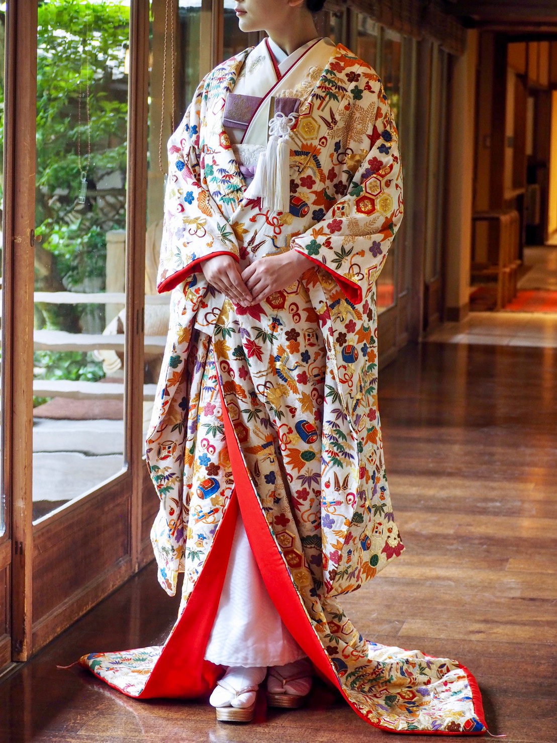 ソシュウエンの魅力の一つでもある庭園の美しい四季の移ろいに合わせ、古くから人々に愛されてきた色鮮やかな色打掛をお召しいただき、お二人の特別な結婚式に、ご自身らしい和装と小物類の色合わせのコーディネートを楽しんでいただくのはいかがでしょうか。